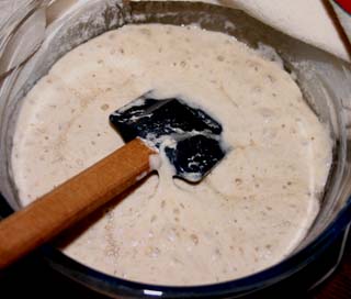 17 January 2007 On reflection, I think I should have time to do this before we go to The Fat Duck - 6 days is double the 72-hour minimum - so I’m going to try and have a fridged starter before we go. Might even get a batch of bread made... 12:30 Stages 1-3 completed. Monitor 16:30, 20:30 and bedtime. 18 January 2007 18:30 This morning nothing was happening, except that the mixture had separated into a layer of flour and a layer of water, like the previous starter. I therefore decided to feed the ’beast’ with ordinary ’soft’ plain flour, on the basis that it’s higher in starch and lower in protein than the strong bread flour. I did this first-thing this morning and again around lunchtime. We went out, returning about 15:00 to find the mixture transformed: so much increase in bulk that I decided to tranfer it to a bigger bowl at the next feed, and lots of large bubbles. On stirring this evening, I found the consistency very ’glutenous’, as Linda describes it. I have now repeated what always seems a dirty deed, tipping the bulk down the sink to leave one cupful and then adding a cup of soft flour and a cup of tepid water. Fermentation looks very vigorous, so I think we’re on the way. Obviously the Tuxford Mill stonrground flour, though it makes good bread, isn’t the best for the starter phase. As yet, no distinctive sourdough smell, but we’re not yet halfway through the 72-hour activation. All this success despite a 3-hour 30-minute power-cut this afternoon, thanks to the storms that are sweeping across the UK. Hooray for global warming! 19 January 2007 14:00 Nice and lively this morning, fed about 8:30 and photographed just now before the next feed - thick, creamy (with no sign of separate liquid on top) and full of bubbles: